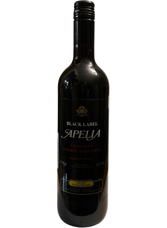 Apelia Black Label Imiglykos ir samtaini pussalds sarkanvīns no Peloponēsas reģiona Grieķijā. Ražots no 100% Agiorgitiko vīnogām, šis vīns piedāvā maigumu, augļu bagātību un harmonisku līdzsvaru. Vīnogas audzētas saulainā un siltā Vidusjūras klimata apstākļos uz minerāliem bagātas augsnes, kas piešķir vīnam izteiktu augļainumu un samtainu struktūru.